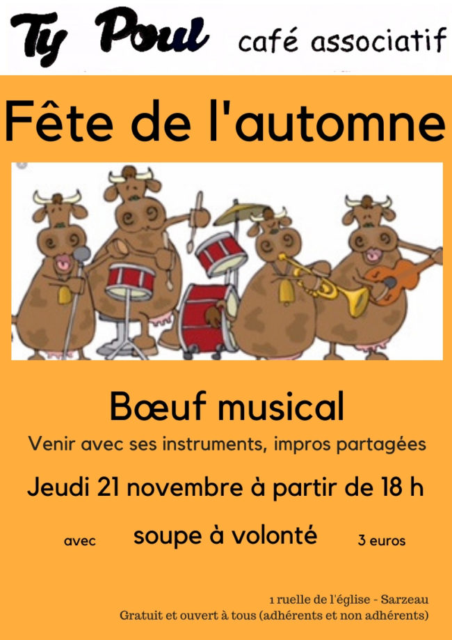 Boeuf Musicaljeudi 21 novembre à partir de 18h. Chacun apporte ses instruments, sa voix, sa joie…On mélange tout, on improvise, et on partage une bonne soupe chaude. Faites passer l’info ! Ouvert à tous