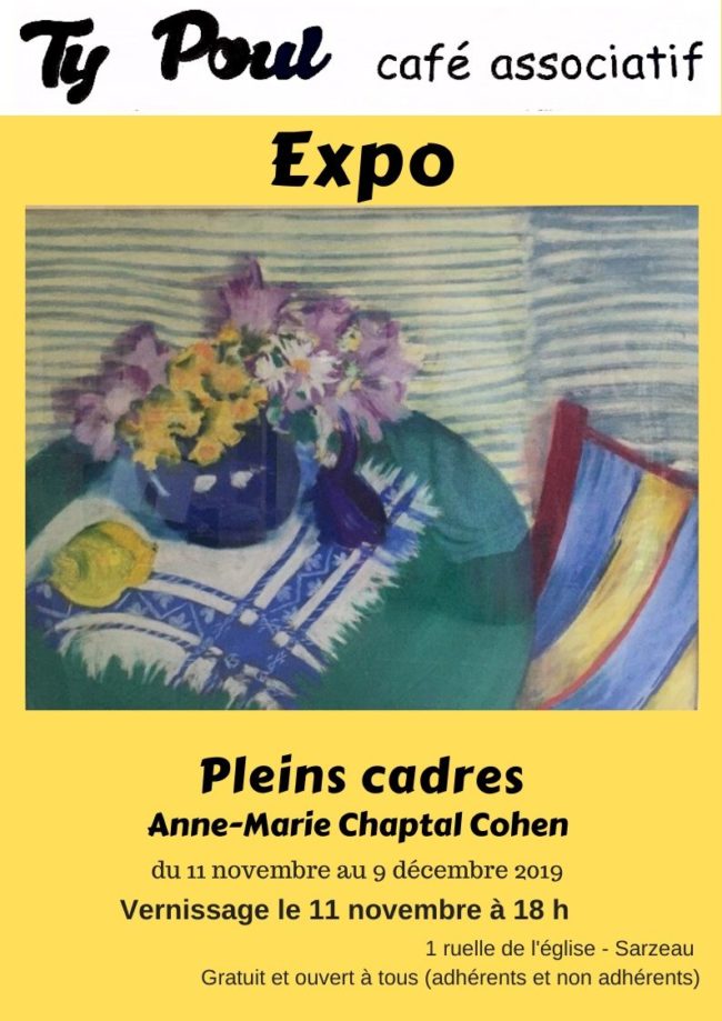 Anne-Marie Chaptal Cohen les toiles d’Anne Marie ont horreur du vide et colorent nos murs ! Du 11 novembre au 9 décembre 2019 Vernissage le 11 novembre à 18h Gratuit et ouvert à tous