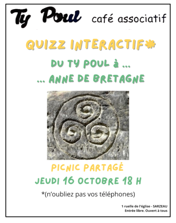 Apportez du salé et/ou du sucré. N’oubliez pas assiettes et couverts. Le Ty Poul s’occupe du reste