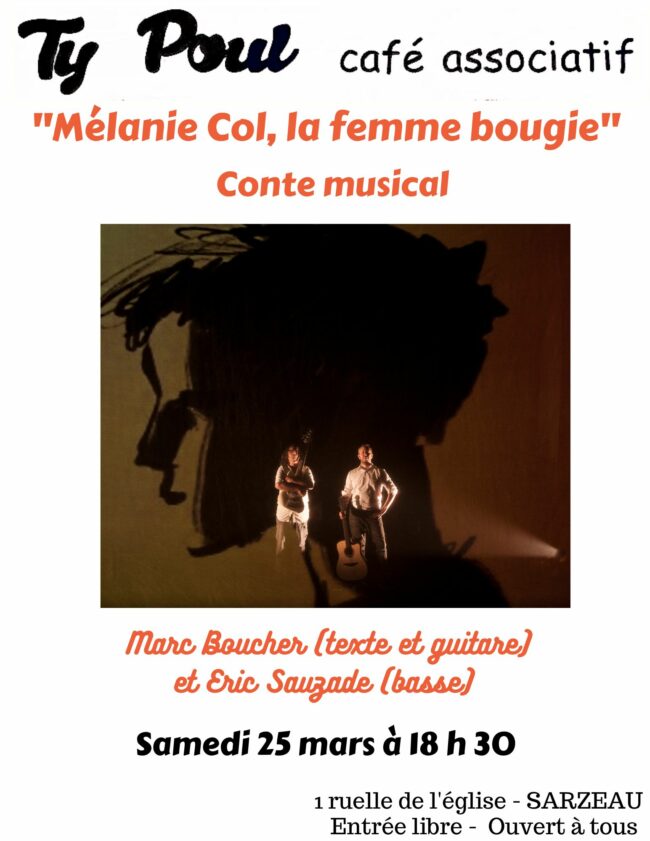 Conte musical Le samedi 25 à 18h30, Entre Conte et Musique, Marc Boucher (texte/guitare) et Eric Sauzade (basse) vous racontent la vie fondante de Mélanie Col (Mélancolie !) La femme bougie… Gainsbourg, Abd el Malik, Gaël Faye, Dominique A, Bashung, Noir Désir et les autres…Balade en slams, poésie et chansons…Mars, mois des filles-femmes-fleurs! ça va donner…