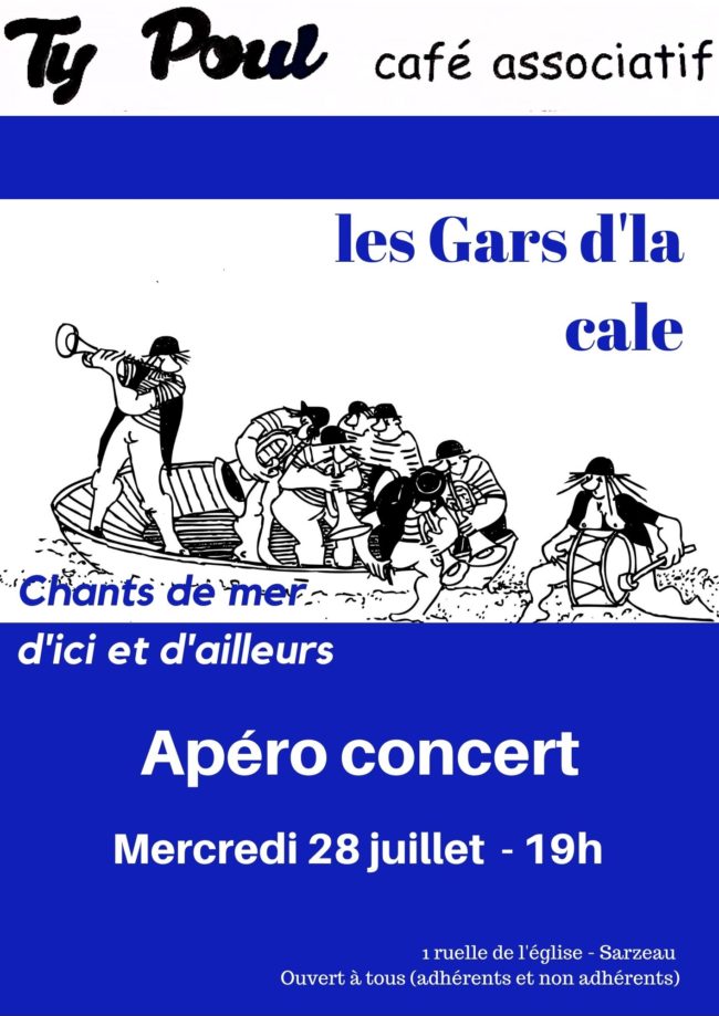 apéro-concert à 19h sur la terrasse Le 28 Juillet les Gars de la Cale chantent pour vous. Chants d’ici et d’ailleurs de terre et de mer avec leurs accordéons, guitares, flute, violon et chœurs. Le 7 Août, ils reviennent avec leur musique et leur belle humeur …mais cette fois pour vous faire chanter, toutes et…
