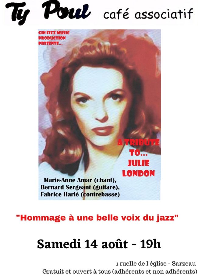 apéro-concert à 19h sur la terrasse Le 14 Août, le trio « Gin Fizz Music » rend hommage à une célèbre chanteuse de jazz d’après-guerre, Julie London. Découverte !