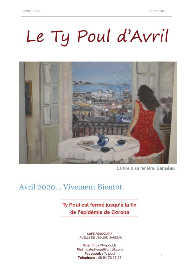 Newsletter D’avril Au Ty Poul, on a fermé les radiateurs…ça caille. On a vidé les frigos….ça gèle. Les bocaux à soupes sont rangés, les fleurs d’hibiscus patientent au frais. J’ai laissé, sur l’ardoise, la liste des chants prévus pour le mardi… voyons…3 mars. Juste pour ne pas perdre le fil du temps et le rattraper à…