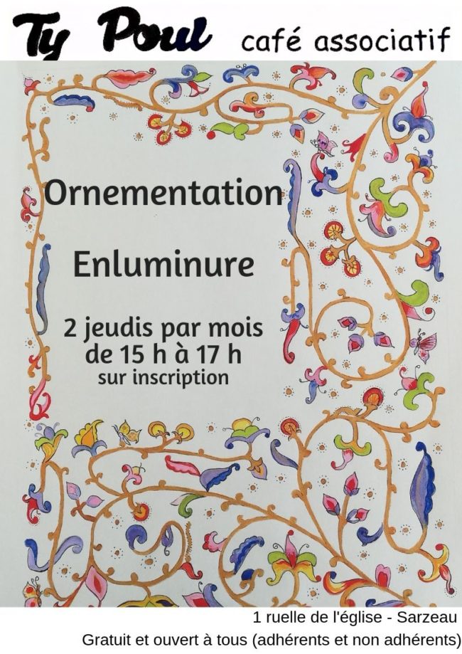 atelier Ornementation enluminure2 Jeudis par mois de 15h à 17h Le 3 et 17 octobre , la première séance de découverte est ouverte à tous, vous vous inscrirez ensuite si affinité !