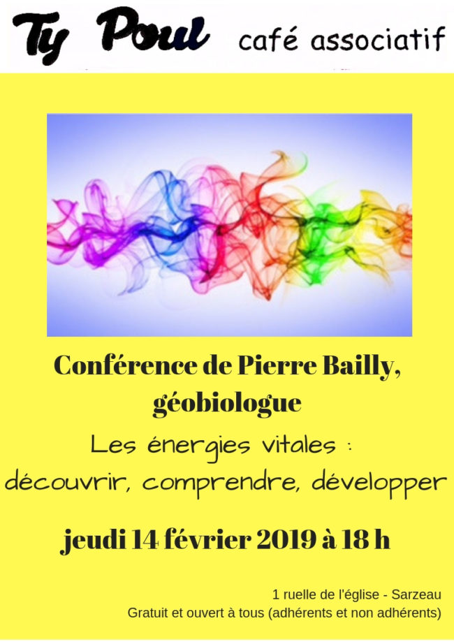 Les énergies vitales, découvrir, comprendre, développer JEUDI 14 février 2019 Une conférence précieuse ! Pierre Bailly, notre géobiologue qui avait déjà échangé avec nous sur les ondes électromagnétiques et naturelles, nous entraîne le 14 à 18h sur les chemins parfois ignorés ou négligés de nos Energies vitales. Celles qui font que nous nous sentons bien…