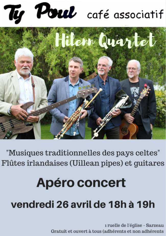 Apéro Concert « Hilenn Quartet » Ouvert à tous, Le 26 avril à 18h ses guitares et ses incroyables, improbables, fascinantes cornemuses irlandaises aux sons uniques…La légende dit qu’une vie ne suffit pas à en maitriser les variations ! …vrai ?