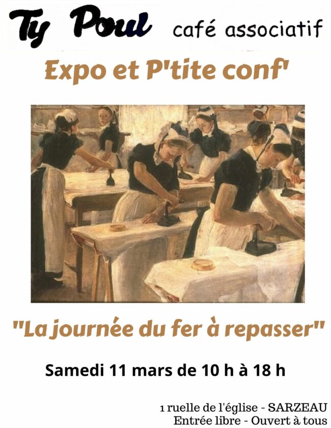 P’TITE CONF Le samedi 11, c’est la journée du fer à repasser ! Michèle l’incroyable collectionneuse, installe ses fers à repasser au Ty Poul. Une longue histoire ! De 10h à 17h, 40 fers (sur près de 2000 !) de toutes formes et tous âges seront exposés… A 17h Michèle vous en parlera ! Apéro…